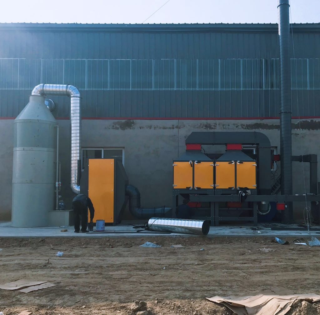 利用高能光束照射惡臭氣體,裂解惡臭氣體、如氨、三甲胺、硫化氫、甲硫醇、甲硫醚、二硫化碳和苯乙烯、硫化物VOC類,苯、甲苯、二甲苯的分子鏈結(jié)構(gòu)、使有機(jī)或無機(jī)高分子惡臭化合物分子鏈,在高能紫外線光束照射下降解轉(zhuǎn)變成低分子化合物如:CO2和H2O等